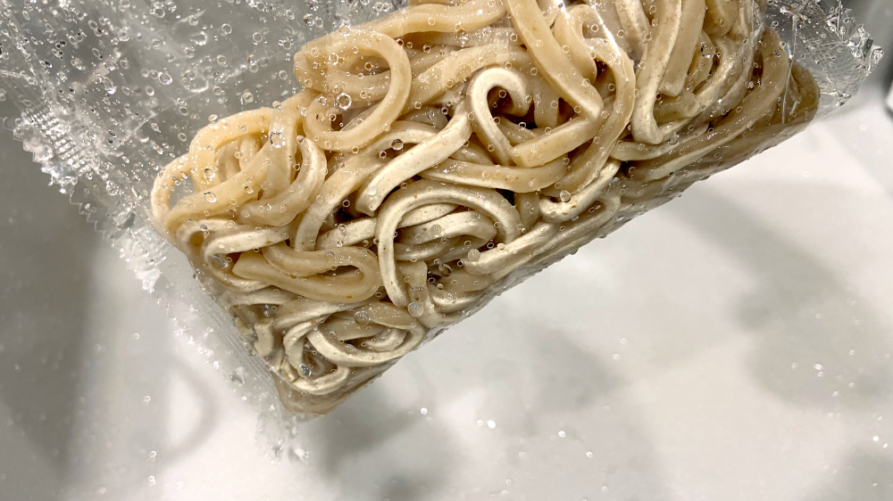 冷水で麺を締める。袋に穴が空いていて勝手に水が切れるので、別でざるを用意する必要なし。洗い物が減って助かる。