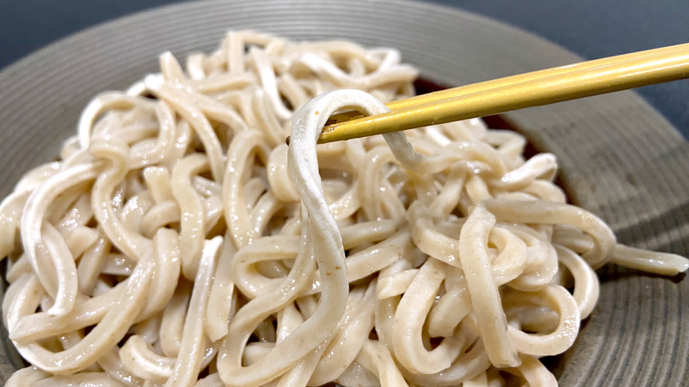 セブン-イレブンの麺よりも少し茶色い見た目。宅麺の麺の方がコシがあり、小麦の風味も強く感じられる。