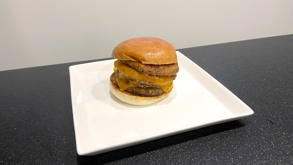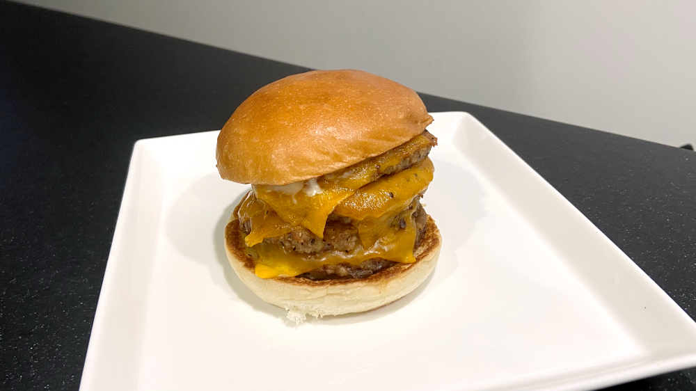 牛肉100%パティ4枚・レッドチェダーチーズ4枚。野菜なしのド直球バーガーだ。