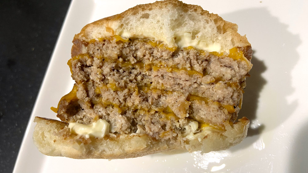 少し食べ進めると、からしマヨに当たる。ほのかな酸味がいいアクセントになって食欲を増進する。肉とチーズを中心としたシンプルな構成なのに不思議と食べ飽きない。