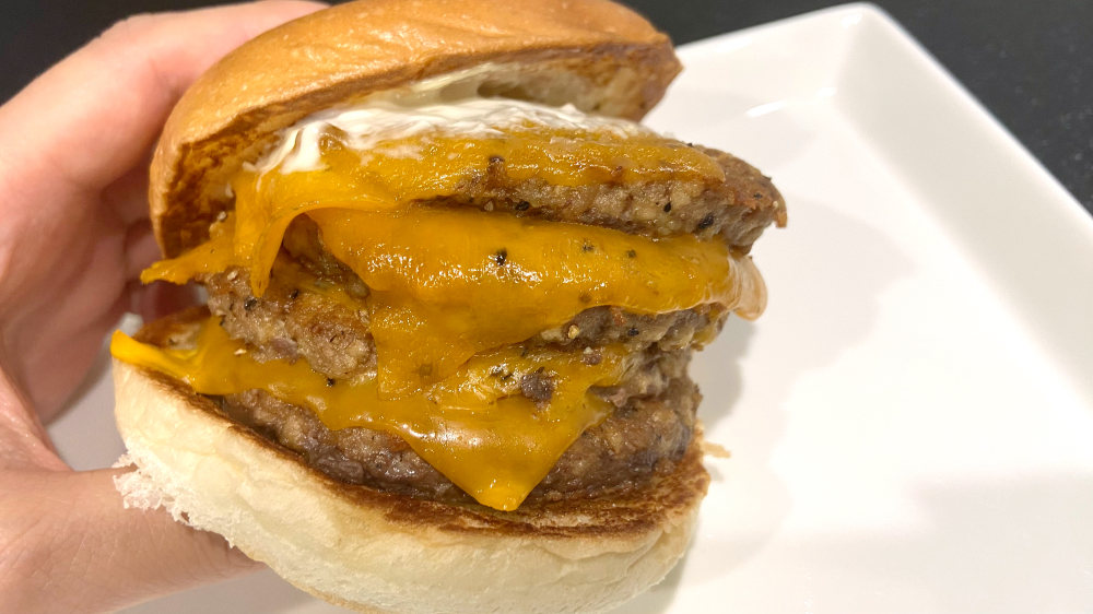 バンズはふんわり食感。パティもやわらかく、顎を酷使せずとも食べられる。4枚の肉を一気にほおばる幸せが、噛むたびにブワッと押し寄せる。最高のご褒美バーガーだ。