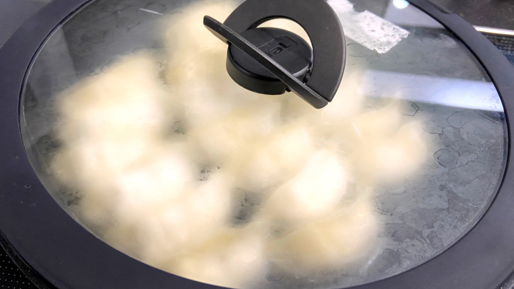 少量の水を入れ、蓋をして蒸し焼きにします。