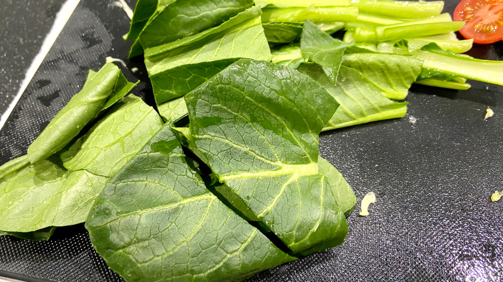 ごぼう・玉ねぎをみじん切り、小松菜を食べやすい大きさに切る