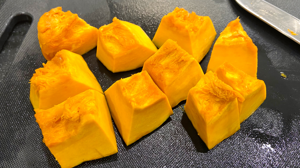 電子レンジで加熱するレシピでしたが、かぼちゃをやわらかくしたかったので煮込みました。